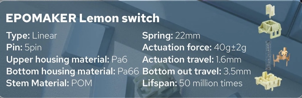 You only get one switch choice with the Tide 75, which is the Epomaker Lemon switch. These are linear switches and come factory-lubed. However, Epomaker made the keycaps shine through, but the switches are not fully see-through, this makes the RGB lacking, you cannot tell that the RGB is on. The switches are light, which makes typing pleasant, and they have a distinct clicky sound to them.
