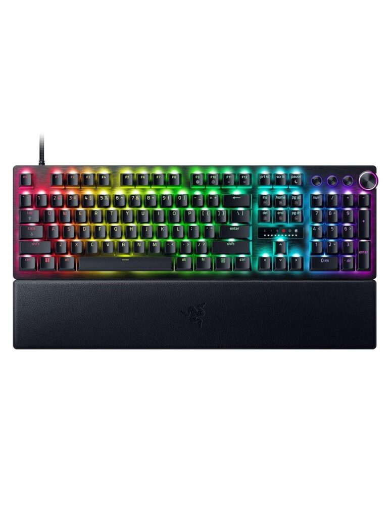 The Analog switches in the Huntsman V3 are linear, which means that they are pretty smooth. They have an actuation force of 40g, and with the per-key stabilizers pushing on the key feels nice and quick. The double-shot PBT keycaps are nicely textured, and with them being shine-through and the keyboard having per-key RGB, the RGB looks amazing. You get a multi-function media key right next to the dial, and the two buttons to the left of that are macro buttons. If you hold the FN key it only lights up the keys which have a secondary function, this is a nice detail that Razer included.