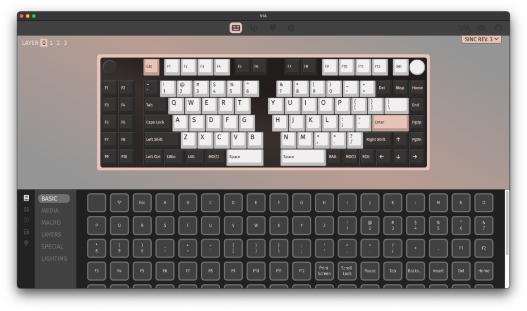 VIA is another popular keyboard firmware, it is user-friendly, allows for real-time customization with just a few clicks, and doesn’t require any code to run. You can change the RGB, change keybinds, change the layout, make layers, and program macros. You don’t need to flash/reflash files, and your configurations will stay on your keyboard even if you turn it off. VIA has two tools, VIA firmware and VIA configurator. The configurator does the functions listed above, and the firmware can work side by side with QMK.